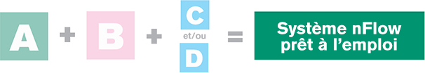 Pour simplifier vos commandes, composez votre système nFlow™ complet en choisissant parmi les références des groupes A (circuits nFlow™) et B (Bonnets), puis les interfaces des groupes C (Embouts narinaires) et/ou D (masques nasaux). A tout moment, vous pouvez commander vos éléments séparément selon vos besoins, permettant ainsi d'éviter les déchets inutiles. Utilisez les guides de taille fournis pour choisir les solutions adaptées à vos patients.